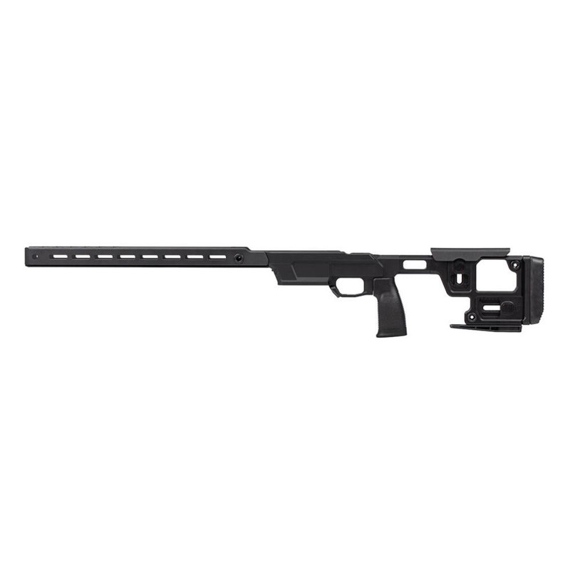 The Solus Competition Chassis is engineered for precise and repeatable rifle-to-body connection with a Remington 700 short action footprint. It features modular construction with M-LOK and Arca Swiss attachment points for customization and adjustability. The chassis prioritizes ergonomics and general purpose compatibility for both hunting and competition applications.