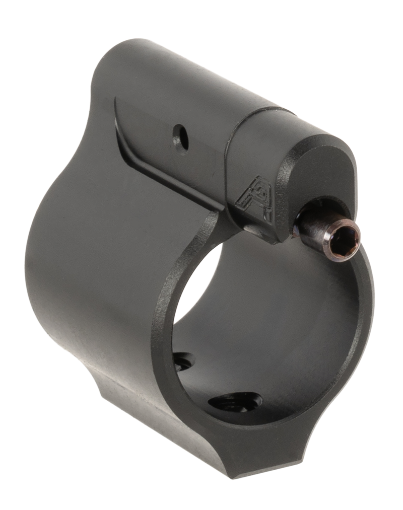 Low-profile adjustable gas block designed for AR-15 platforms with 0.750" barrels. Features nitride or DLC coating finish and allows fine-tuning of the gas system for suppressed firearms and competition builds. Standard low-profile design fits under slim profile free float handguards including Aero Precision R-ONE and S-ONE handguards.