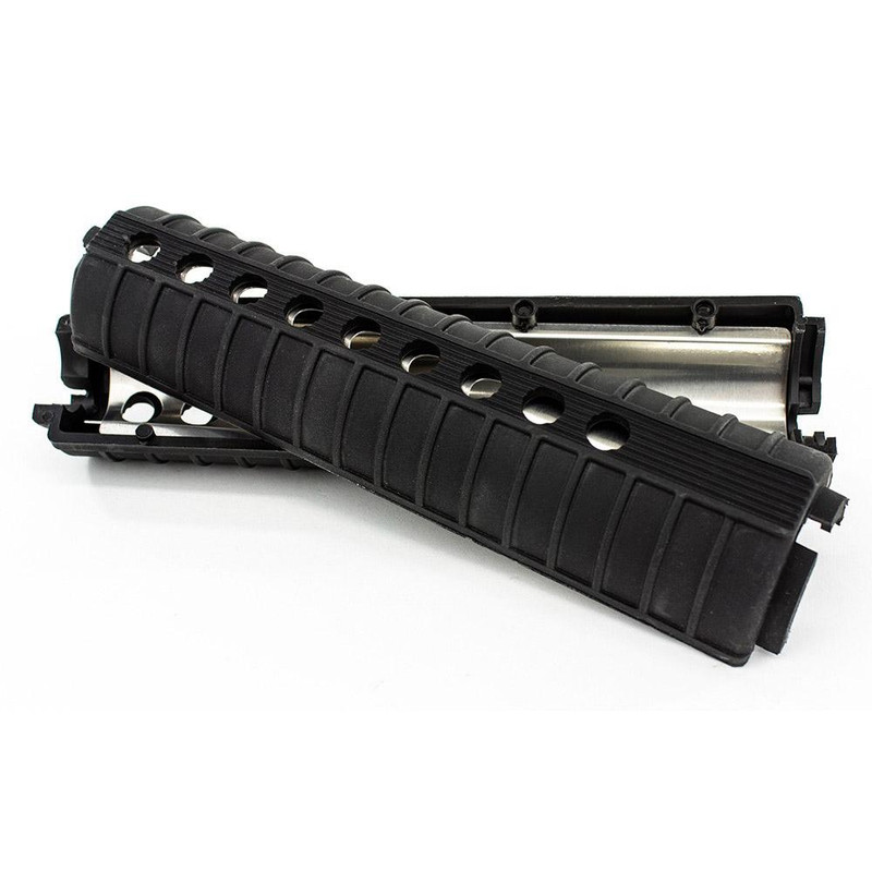 Drop-in mil-spec polymer handguard designed for AR-15/M4 platforms, featuring aluminum heat shields on upper and lower halves for hand protection. Installs between the delta ring barrel nut and round handguard cap (compatible with triangular cap). Provides a classic USGI appearance with modern heat management.