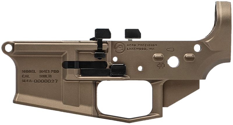 This Aero Precision M4E1 Pro is a stripped lower receiver chambered in 5.56 NATO/.223 Remington with semi-automatic action. Machined from 7075-T6 forging with ambidextrous controls and Kodiak Brown anodized finish.