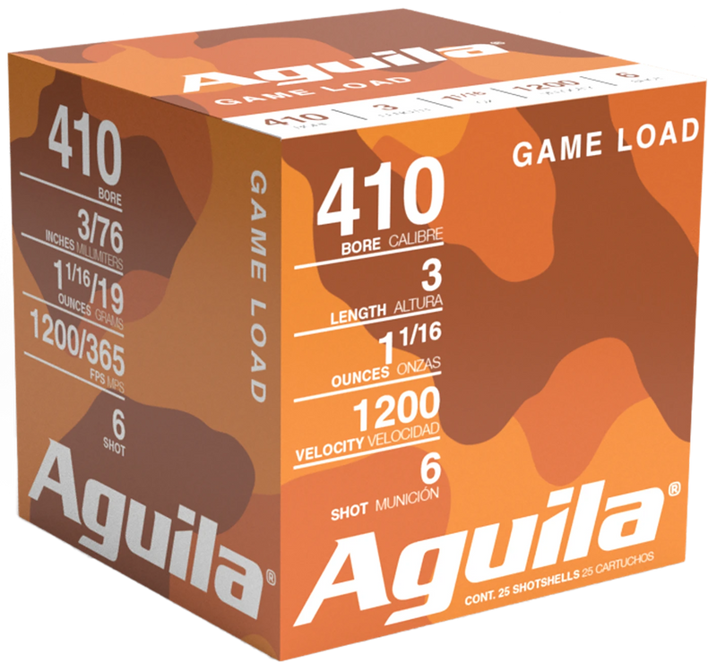 Aguila Game Load shotshells in .410 bore, 3" length, featuring 11/16 ounce of #6 lead shot designed for hunting and field use. These standard velocity rounds deliver consistent patterns and reliable performance for game hunting applications, with a muzzle velocity of 1200 fps.