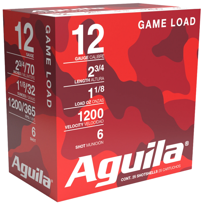 Aguila Game Load shotshells in 12 gauge with 2.75" plastic hulls deliver 1 1/8 oz of #6 lead shot at 1200 fps. Engineered for hunting upland game and waterfowl, these standard velocity loads offer reliable performance at an affordable price point.