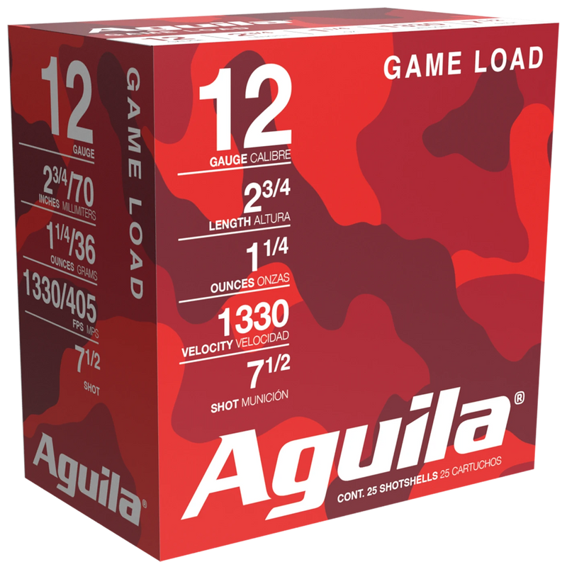 Aguila High Velocity Game Load shotshells in 12 gauge with 2.75" shells loaded with 1 1/4 oz of #7.5 lead shot at 1330 fps. These loads are designed for hunting and target shooting and are made with clean combustible powders for maximum output and minimum residue. Each box contains 25 rounds.