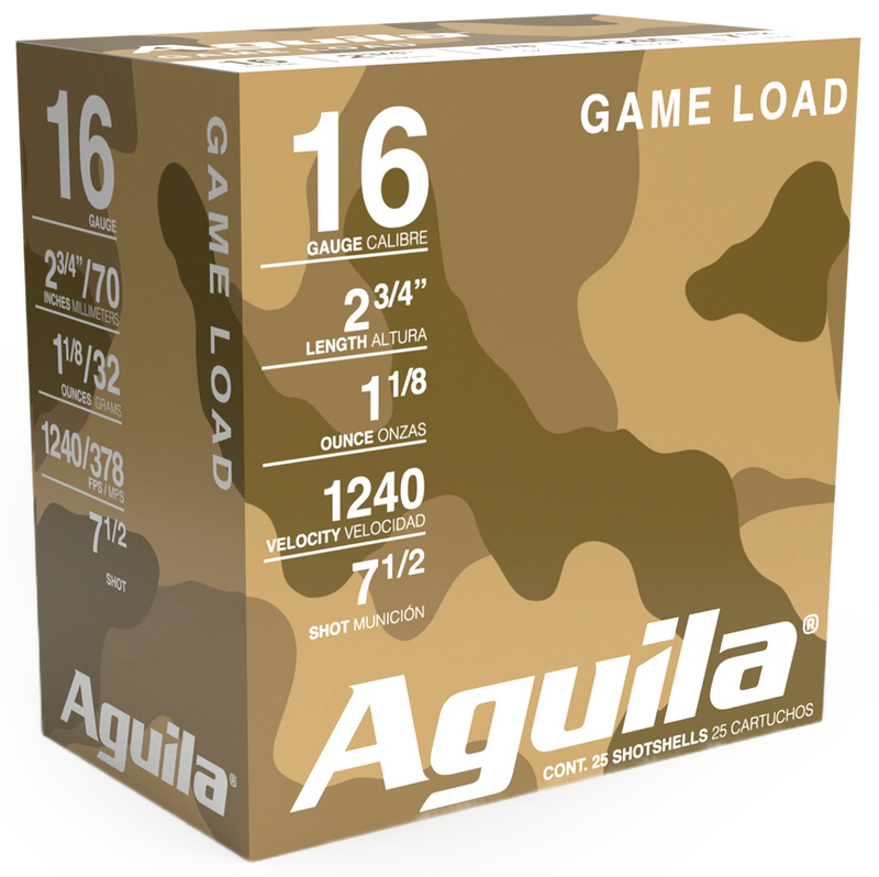 Aguila Game Load shotshells are engineered for hunting and target shooting in 16 gauge with a 2.75" plastic casing. These high velocity loads feature 1 1/8 oz of #7.5 lead shot at 1240 fps, utilizing clean combustible powders for maximum output and minimum residue.