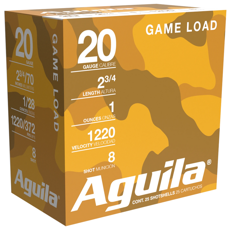 Aguila Game Load shotshells in 20 gauge with 2.75" plastic cases deliver 1 ounce of #8 lead shot at 1220 fps, engineered for hunting and target shooting. These high velocity loads use clean combustible powders for maximum output and minimum residue, making them suitable for game hunting applications.