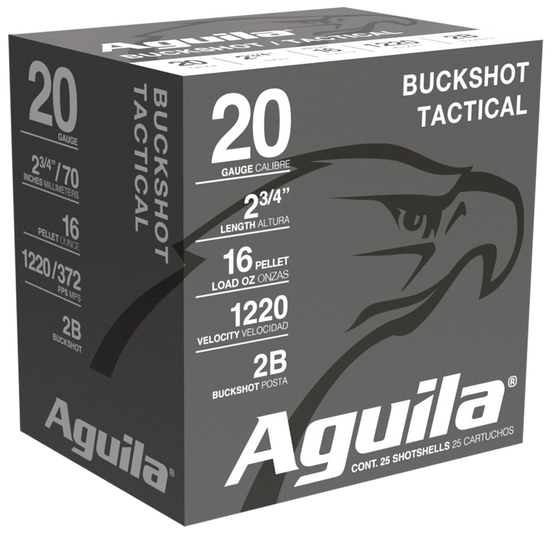 Aguila 20 gauge buckshot loaded with 1 oz of #2 buck shot at 1220 fps muzzle velocity. Plastic casing with 25 rounds per box. Designed for hunting applications with consistent performance and reliable cycling.