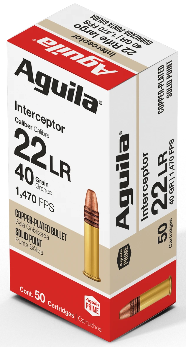 Aguila Interceptor .22 LR ammunition loaded with 40 grain copper-plated solid point bullets at 1470 fps. Engineered for hunting and target shooting applications with brass casing.
