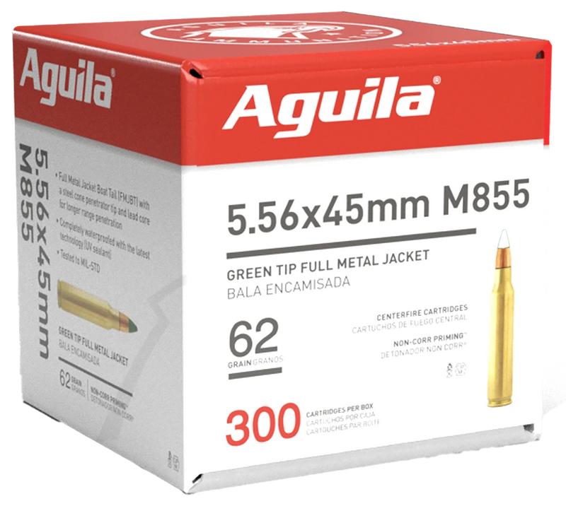 Aguila M855 Green Tip ammunition in 5.56x45mm NATO with 62-grain full metal jacket boat tail bullets. Delivers 3260 fps muzzle velocity and 1298 ft-lbs muzzle energy from a brass casing with boxer primer. The boat tail design provides improved accuracy and consistency at extended ranges for target shooting and tactical applications.