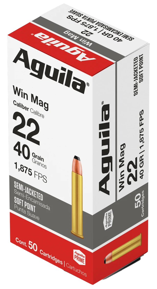 Aguila .22 WMR ammunition featuring a 40-grain semi-jacketed soft point bullet designed for varmint hunting and pest control with bolt-action rifles. This high-velocity rimfire round delivers 1875 fps muzzle velocity and 312 ft-lbs of energy with brass casing.