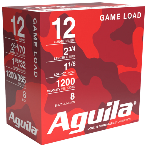 Aguila 12 gauge shotshell ammunition in 2.75" length with 1-1/8 ounce #8 shot, ideal for bird hunting and clay shooting. This case lot contains 250 rounds of consistent, reliable ammunition for sport and hunting applications.