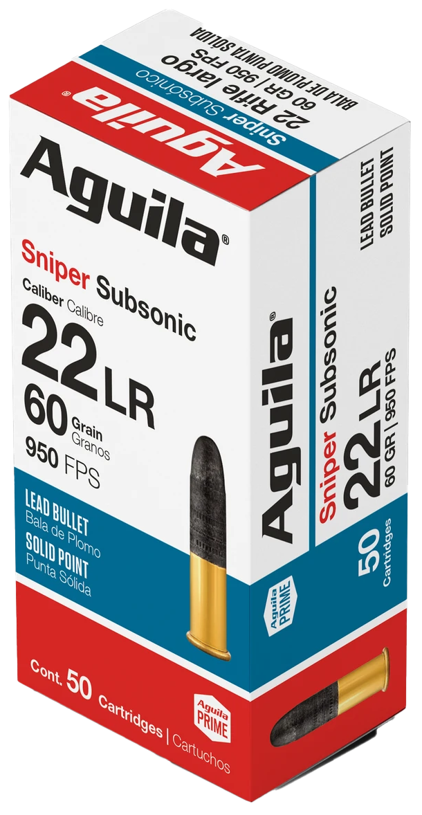 Aguila Sniper Subsonic .22 LR ammunition features a 60-grain lead solid point bullet loaded to 950 fps with approximately 120 ft-lbs of muzzle energy. Designed for target shooting and small-game hunting with subsonic performance and reduced noise, this brass-cased, reloadable ammunition is recommended for use in barrels longer than 20 inches.