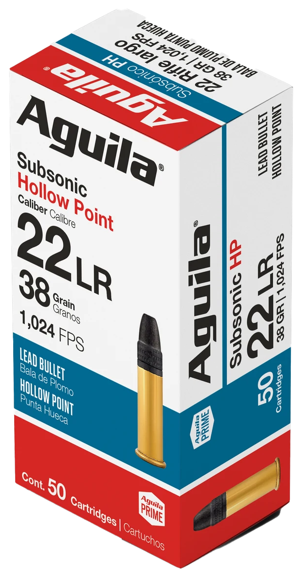 Aguila Subsonic .22 LR ammunition features a 38-grain lead hollow point bullet loaded to 1024 fps for reduced noise and recoil. The brass casing makes this round suitable for small game hunting and target shooting with reliable expansion and accuracy.
