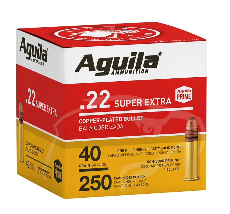Aguila Super Extra High Velocity .22 LR ammunition features 40-grain copper-plated solid point bullets with a muzzle velocity of 1255 fps. Brass cased and ideal for target shooting, plinking, and introducing new shooters to rimfire firearms.