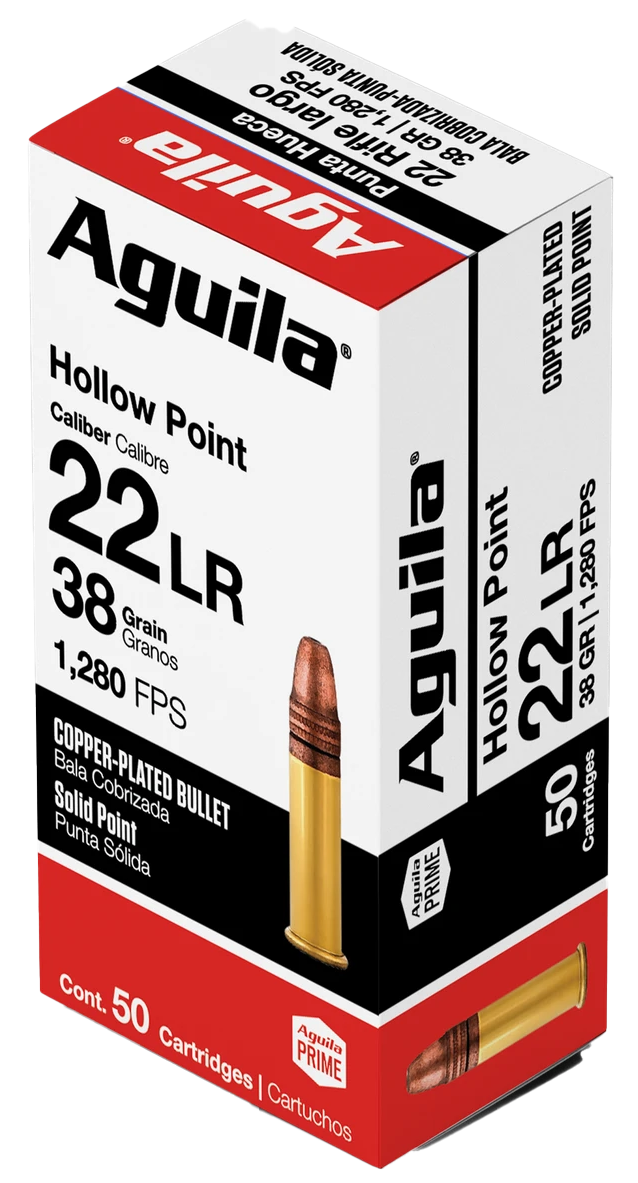 Aguila Super Extra High Velocity .22 LR rimfire ammunition loaded with 38-grain copper plated hollow point bullets at 1280 fps. This round is designed for small game hunting and varmint control, offering controlled expansion with brass casings suitable for reloading.