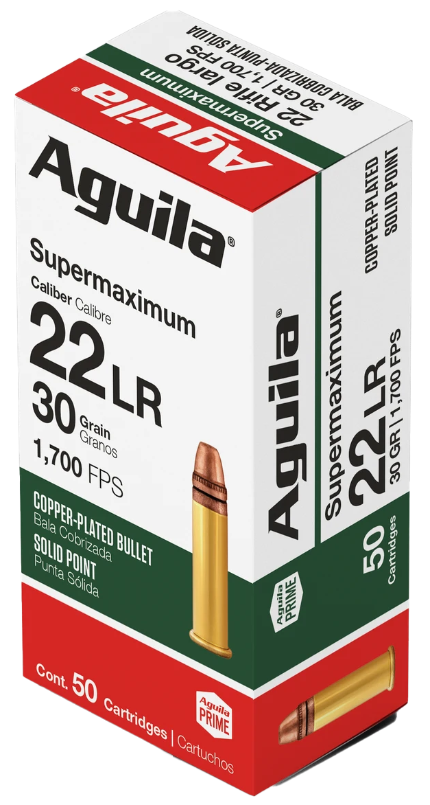Aguila Supermaximum .22 LR ammunition features 30-grain copper-plated solid point bullets with a muzzle velocity of 1700 fps, delivering high velocity performance for small game hunting, varmint control, and target shooting. The brass casing is reloadable and provides reliable, accurate performance across a range of shooting applications.