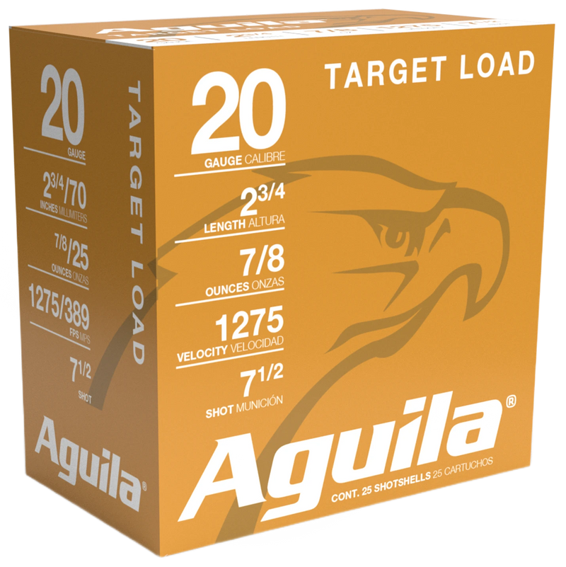 Aguila Target Load Competition shotshells in 20 gauge with 2.75" casings, delivering 7/8 oz of #7.5 lead shot at 1275 fps. Designed for target shooting and range use, these rounds offer consistent performance from Aguila's shot tower process. Packaged 25 rounds per box with 10 boxes per case.
