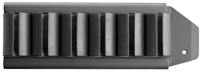 This is a 6-round side shell carrier designed for Mossberg 500/590/500A shotguns. It features a polymer construction with an aluminum mounting plate for secure attachment to the shotgun's receiver. The carrier holds 12 gauge shells and measures 11.5" x 4.4" x 1.6".