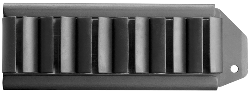 This side-mounted shell carrier holds 6 rounds of 12 gauge ammunition and is specifically designed for Remington 870 shotguns. The polymer construction with aluminum mounting plate provides a lightweight, durable solution for quick access to extra shells during shooting. Measures 11.1" L x 4.0" W x 1.5" H and mounts securely via the included aluminum mounting plate.