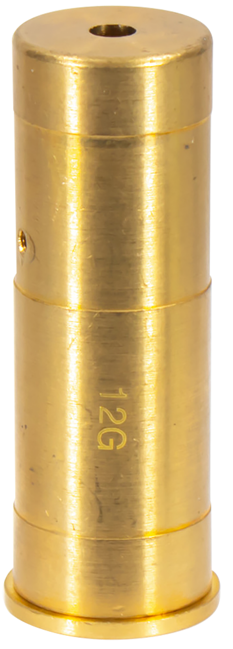 This laser bore sighter is designed for 12 gauge shotguns and uses a chamber-mounted cartridge-style design for quick barrel alignment. It features a 635/655 nM wavelength laser and operates on an LR44 battery. The brass construction measures 9.3" in length and is intended for firearm alignment purposes.