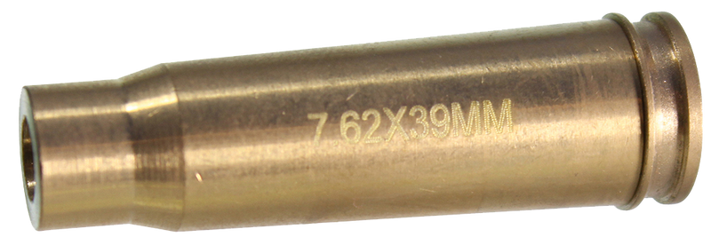 Laser bore sighter designed for 7.62x39mm caliber firearms, featuring a chamber-mounted cartridge style for quick alignment. Emits 635/655 nM wavelength laser light and uses an LR41 battery. Constructed from brass for durability and precision alignment of rifle optics.