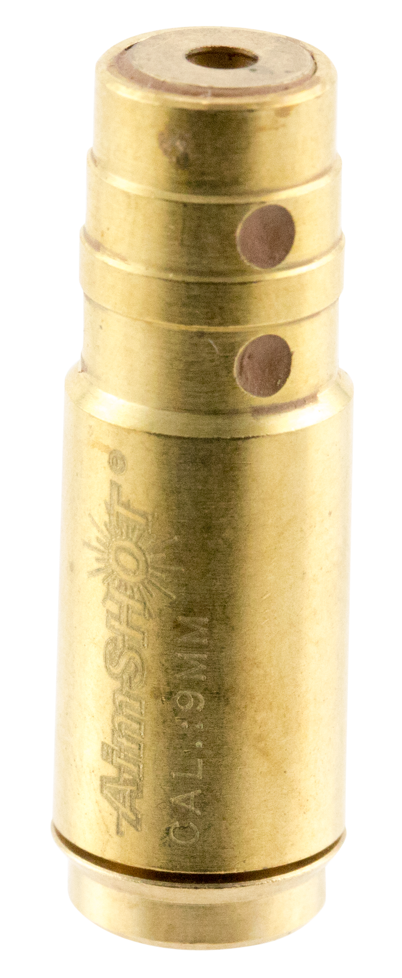 This modular laser bore sighter is designed for 9mm Luger chambered firearms and uses a cartridge-style chamber mount for quick alignment. It features a brass construction with an external battery box and uses LR41 batteries. The device aids in initial sight-in and alignment of firearms before live fire.