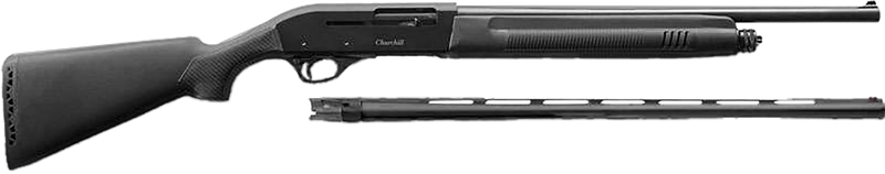 The Akkar Churchill 220 Combo is a 20 gauge semi-auto shotgun with interchangeable 18.5" and 26" barrels, 3" chamber, and 5+1 capacity. Features a blued metal finish, black synthetic stock, fiber optic front sight, and includes full, improved cylinder, and modified chokes. Weighs 5 lbs with an overall length range of 37.5" to 47.5" depending on barrel selection.