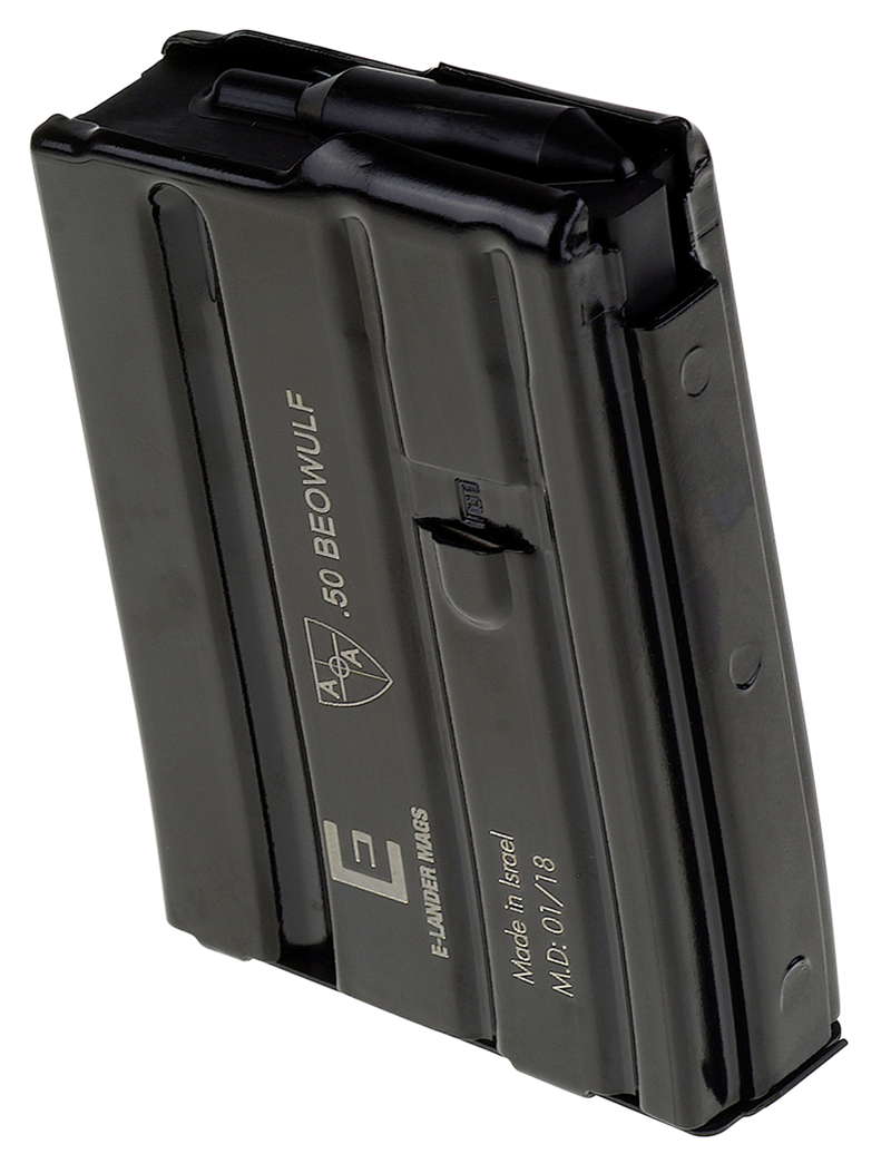 Alexander Arms 4-round steel magazine designed for the .50 Beowulf AR-15 platform. Manufactured by E-Lander with black steel construction, measuring 8.8" long x 3.3" wide x 1.0" tall. Compatible with .50 Beowulf weapon systems.