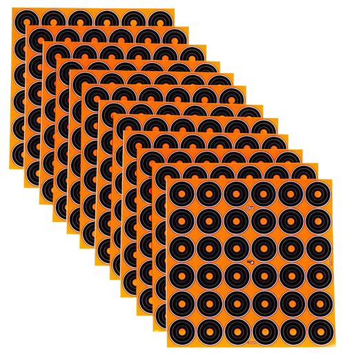 Self-adhesive paper targets featuring 3" black bullseyes on orange background designed to improve shooting accuracy and confidence. Each pack contains 12 sheets with splash-back visibility for clear shot marking. Suitable for firearms practice and training applications.