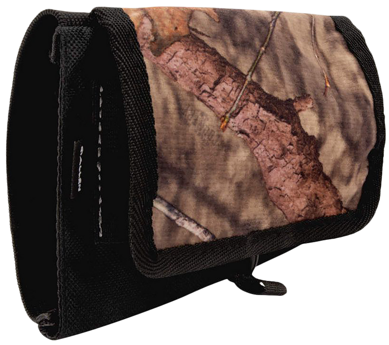 This elastic buttstock shell holder features a quiet opening and closing flap cover for secure storage of 5 shotgun shells. Designed for slip-on mounting to shotgun stocks, it keeps extra ammunition quickly accessible during hunting or shooting. The Mossy Oak Break-Up Country camouflage pattern provides concealment in woodland environments.