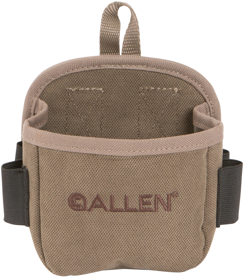 The Allen 2203 Select Shell Carrier is a tan canvas accessory designed to hold up to 25 rounds of ammunition. It features a belt clip mount for convenient carry and easy access during shooting activities. The compact 5.0" x 5.0" x 2.0" design makes it practical for hunters and sport shooters.