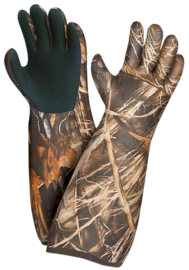 Neoprene decoy gloves in Realtree Max-5 camouflage pattern, one size fits all. Features waterproof construction designed for waterfowl hunting and outdoor use. Weighs 58 oz with dimensions of 18" length by 12" width by 5" height.