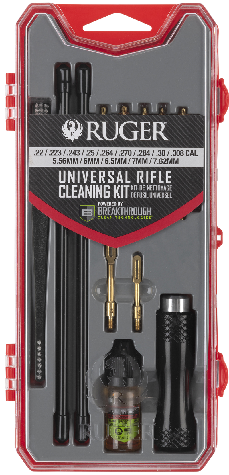 Universal rifle cleaning kit designed for calibers .22 to .30, featuring a molded case for storage and transport. Includes essential cleaning components in red and gray colors. Suitable for general rifle maintenance and field cleaning.