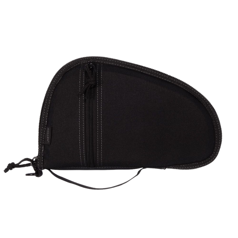 This is a soft handgun case designed to protect a single pistol during transport and storage. It features durable black polyester construction with a lockable zipper, interior muzzle pocket to prevent movement, and a front accessory pocket for cleaning tools or magazines. Exterior dimensions are 10.5" x 6.5".