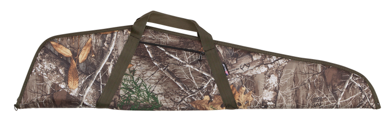 This 46-inch Allen Emerald rifle case features durable Endura material with Realtree Edge camouflage and olive trim accents. The case includes foam padding for firearm protection, non-absorbent lining to prevent moisture damage, and lockable zippers for secure transport.