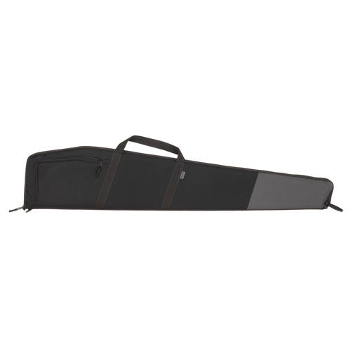 The McCoy Rifle Case is a 50-inch soft-sided rifle case constructed from durable Endura fabric in black and heather gray. Features include padded protection, a locking zipper for security, large gusseted accessory pockets for storage, and a padded carry handle for comfortable transport to the range.