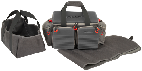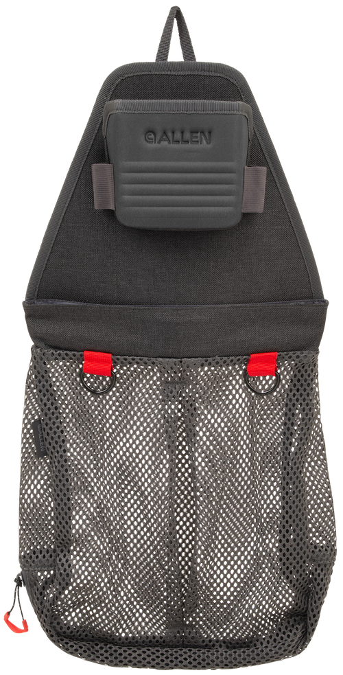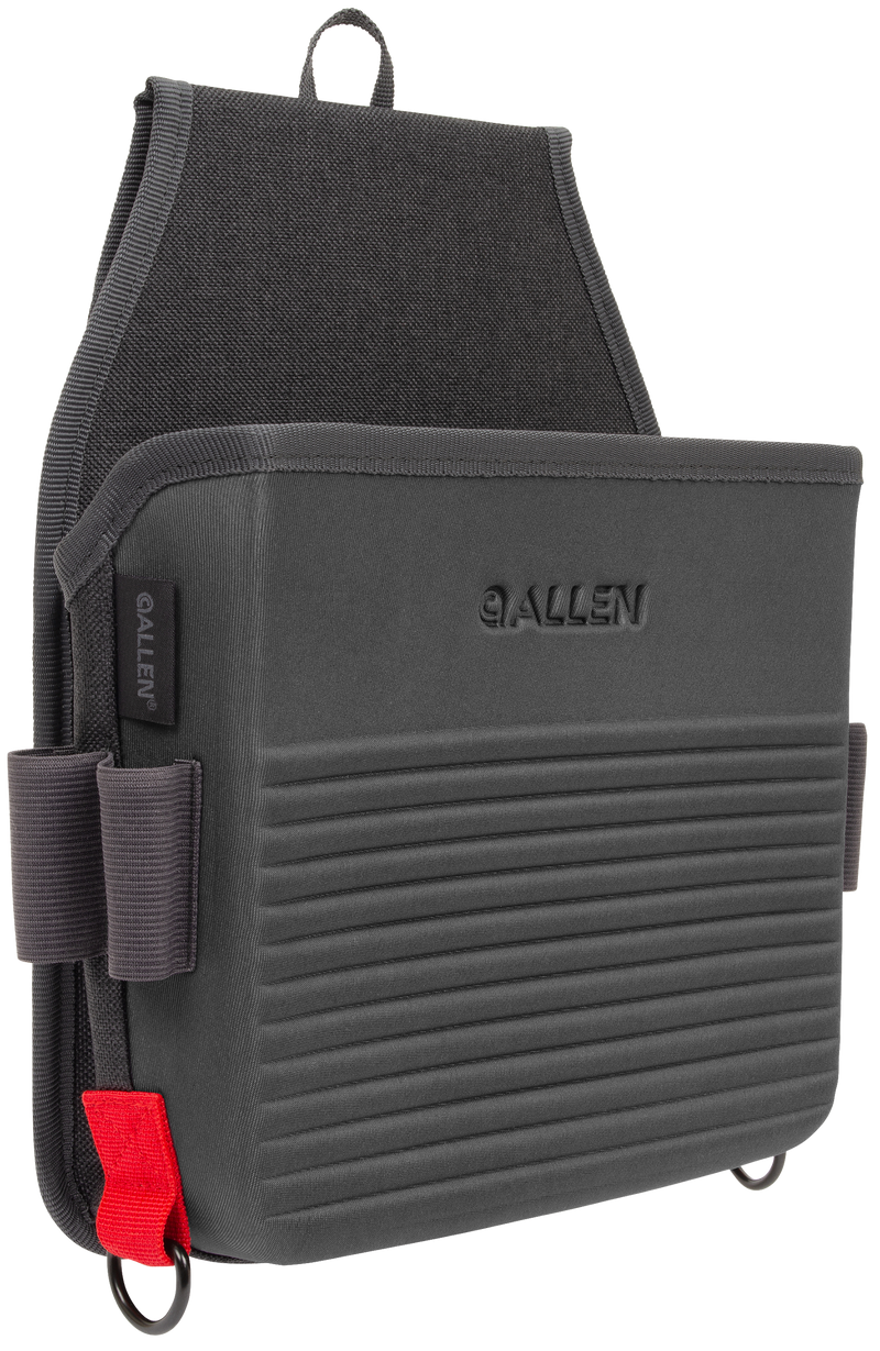 The Allen Competitor Shell Bag is a waist-mounted accessory designed to hold a minimum of 50 loose shotgun shells or spent hulls during shooting sports. Built from durable gray molded EVA material, it features four elastic loops for choke tubes or extra shells, two D-rings for attaching safety glasses or a towel, and a two-inch webbed belt with quick-release buckle that adjusts up to 52 inches.