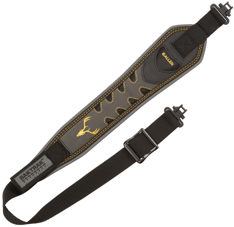 The Allen Aspen is an adjustable rifle and shotgun sling made from gray nubuck leather with BakTrak backing for durability and comfort. It features included swivels and adjusts from 28" to 35" in length. The 1.2" width provides a comfortable carry option for hunters and sport shooters.