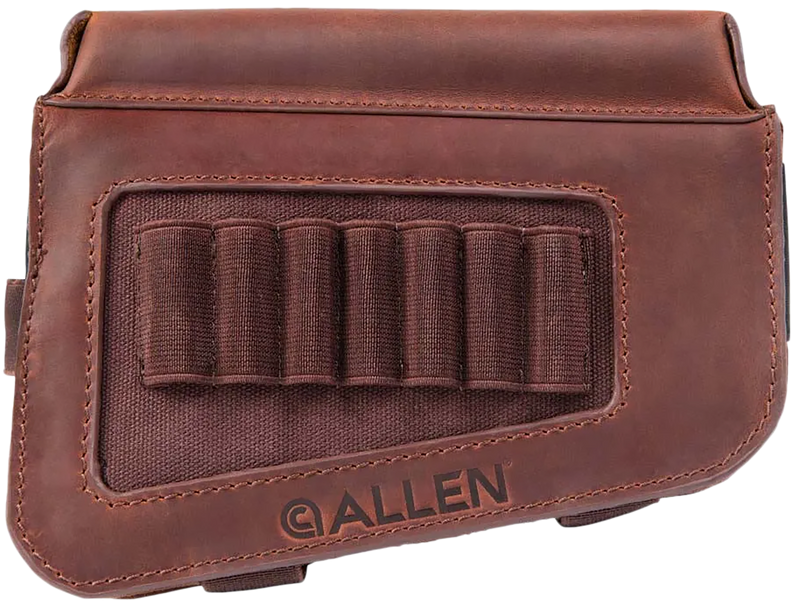 The Allen Westcliff is a leather buttstock-mounted cartridge carrier designed to hold 7 rifle rounds. It features a raised cheek piece for improved shooting comfort and mounts directly to the rifle buttstock. Dimensions are 9.0" L x 7.8" W x 1.8" H.