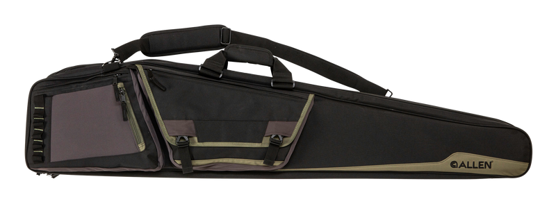 This Allen Rocky double rifle case accommodates 2 rifles and features a durable Endura material construction with black and tan finish. The case includes lockable zippers, daisy chain loops, and an adjustable, removable padded shoulder strap for convenient transport. Dimensions are 50" long with 29.5" length, 15.9" width, and 15.6" height.