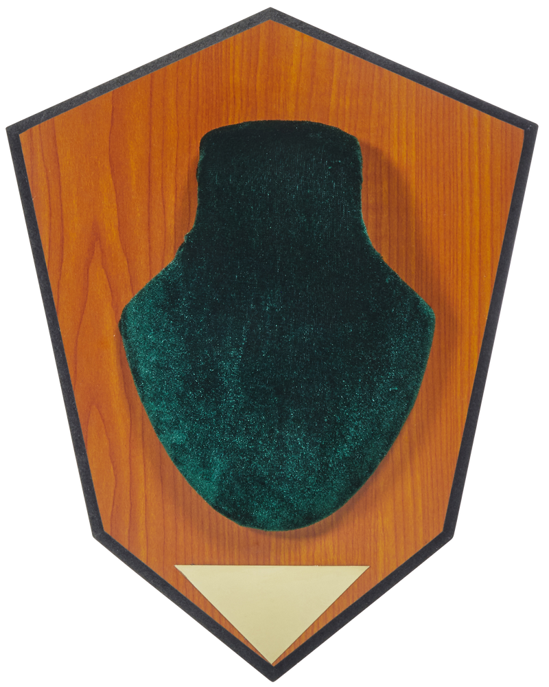 A sturdy wall-mounted plaque with wood grain laminated finish designed for displaying deer antlers and trophy mounts. Includes a formable skull cover that adapts to most horn configurations and features an engravable nameplate. Dimensions are approximately 12.8" L x 9.7" W x 3" H.