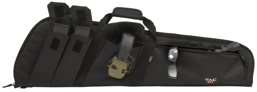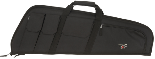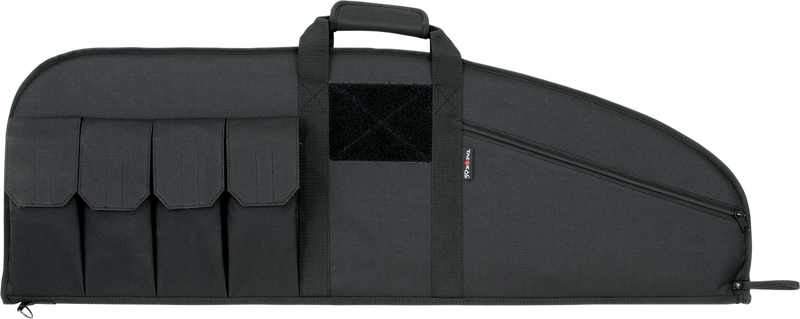 The Allen Company Tac Six Range Tactical Rifle Case is a 37" x 13.5" rifle case constructed from heavy-duty Endura fabric with soft knit lining and thick foam padding. Features include four magazine pockets with hook and loop closures, a large zippered accessory pocket, a 5.25" x 4.25" hook and loop patch for morale patches, and a locking zipper for security.