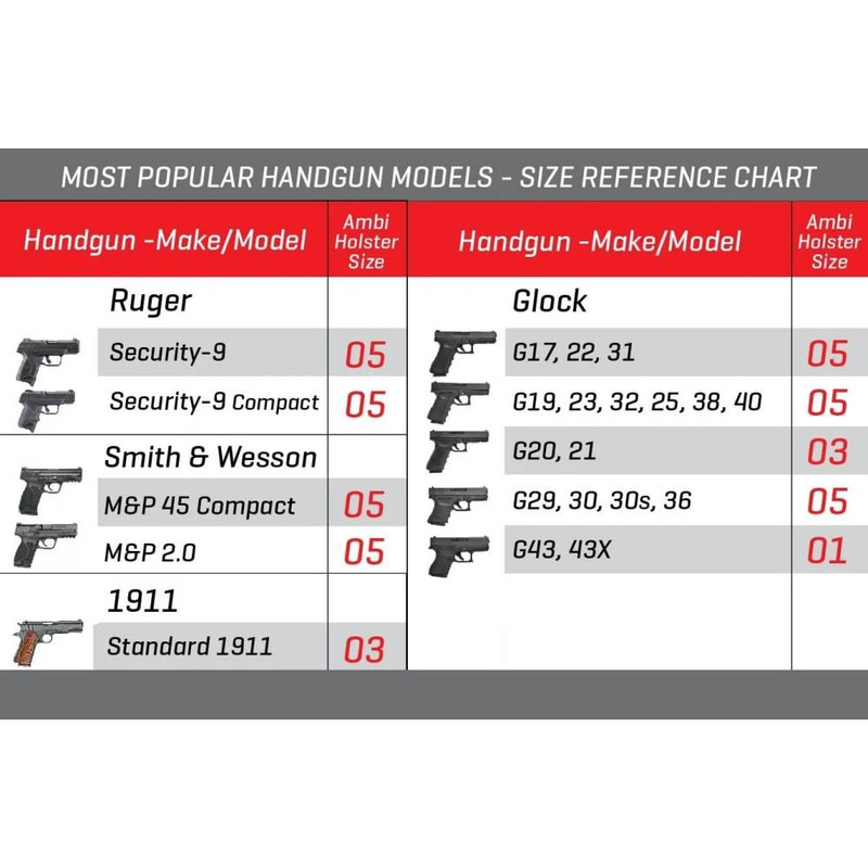 This ambidextrous belt holster fits medium frame semi-automatic pistols with 3-4 inch barrels and includes an adjustable magazine pouch. Features a thumb break retention system, web sight guard, and smooth interior lining for faster draw speeds. The steel spring clip accommodates belts up to 1.5 inches wide and is suitable for both right and left-handed shooters.