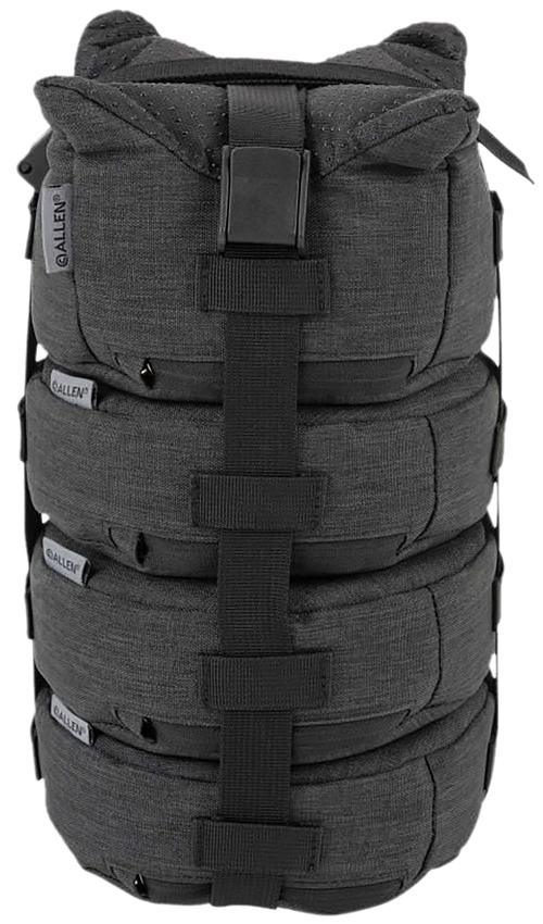 The Allen Eliminator Basic is a double compartment shooting bag designed for range and field use, featuring molded components for durability and a removable divider to separate ammunition and spent shells. It includes an adjustable waist belt, accessory loops, a dump zipper on the hull pouch, and side pockets, with exterior dimensions of 7" x 4.75" x 12".