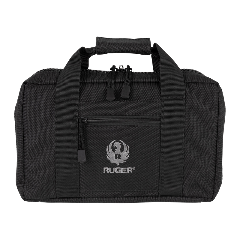 This double handgun case by Allen Company is licensed by Ruger and constructed from rugged Endura fabric. It features two internal zippered padded handgun pockets, internal magazine holders, multiple accessory loops, and comfortable filled carry handles with external MOLLE loops for versatile attachment options.