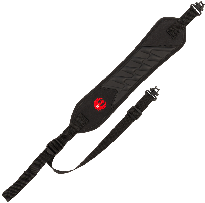This lightweight rifle sling features low-density foam construction covered in rugged neoprene fabric with a non-slip textured back for secure handling. The sling is made with heavy-duty web material and includes swivels tested to 300 pounds, making it suitable for most long guns. Adjustable length of 20.25" OAL with an embroidered Ruger logo.