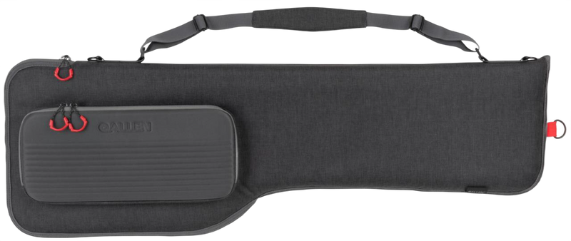 This Allen Competitor Series soft case is designed for takedown shotgun models and measures 35.75 inches in length with 12.3 inches width and 2.8 inches height. It features dense foam padding, a molded exterior pocket for shells and accessories, lockable zipper hardware, adjustable shoulder strap, and an integrated D-ring for secure transport to the range or during travel.