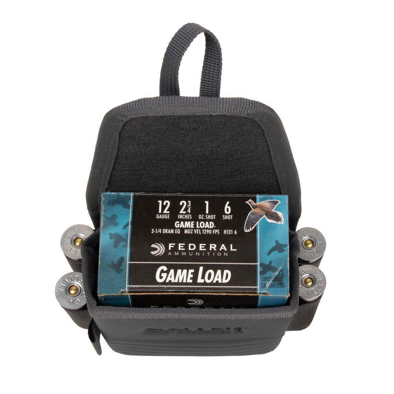 Molded EVA shell carrier designed for shotgun ammunition storage, holding one standard box of 12-gauge 2¾" shells or 25 spent hulls. Features four external elastic shell loops, two D-rings for attaching accessories, and a web belt loop for attachment to most belts. Durable construction suitable for clay shooting, skeet, and hunting applications.