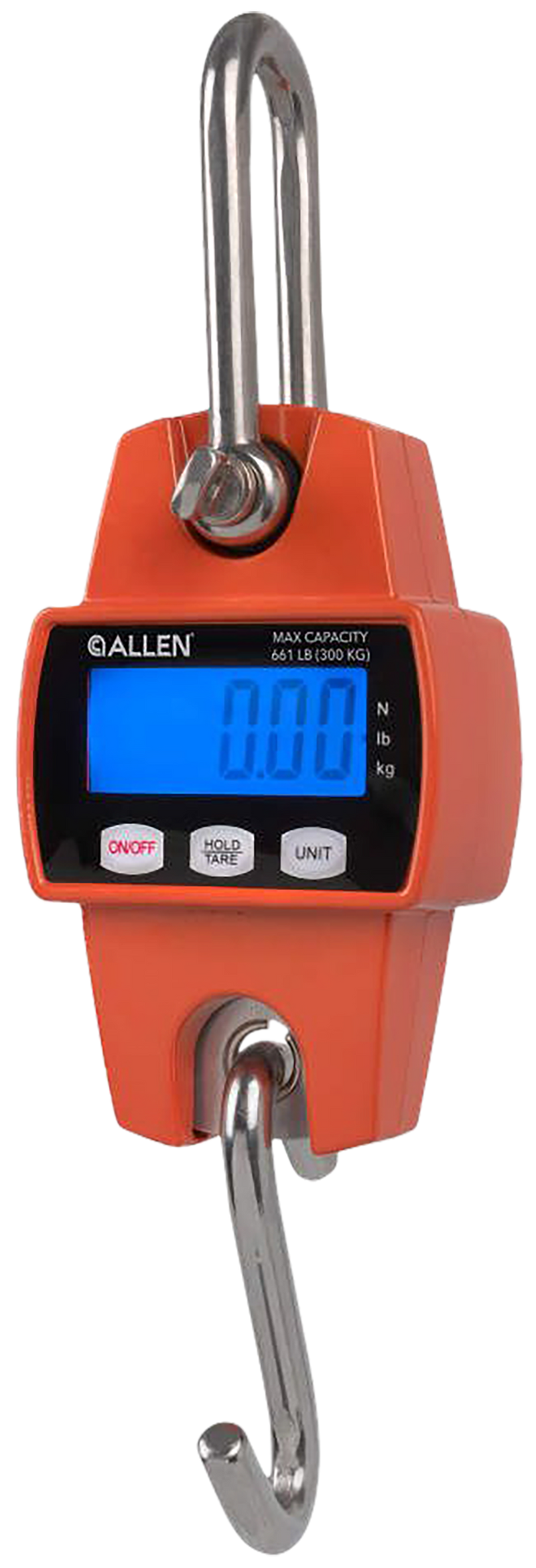 A handheld digital scale designed for weighing game in the field with a sturdy stainless-steel hook and shackle assembly that connects in seconds. The scale displays results in large, bold font on an LED screen and operates on AAA batteries for portable convenience. Dimensions are 13.7" x 10" x 2.1" and it features durable stainless-steel construction.