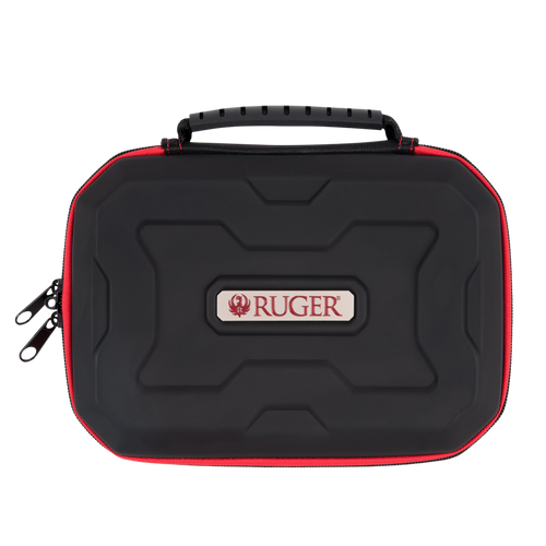 The Exo Handgun Case features a thermo-molded exoskeleton with micro egg crate foam interior designed to protect handguns from dings and scratches. Heavy-duty lockable zippers provide security, and the case includes a brushed metal Allen nameplate and molded carrying handle for convenient transport.
