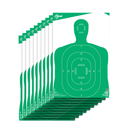 Pack of 25 paper silhouette targets measuring 12" x 18" with black and white coloring designed for hanging. These targets feature a standard silhouette shape suitable for pistol and rifle practice. Paper construction provides an economical option for range training and marksmanship development.